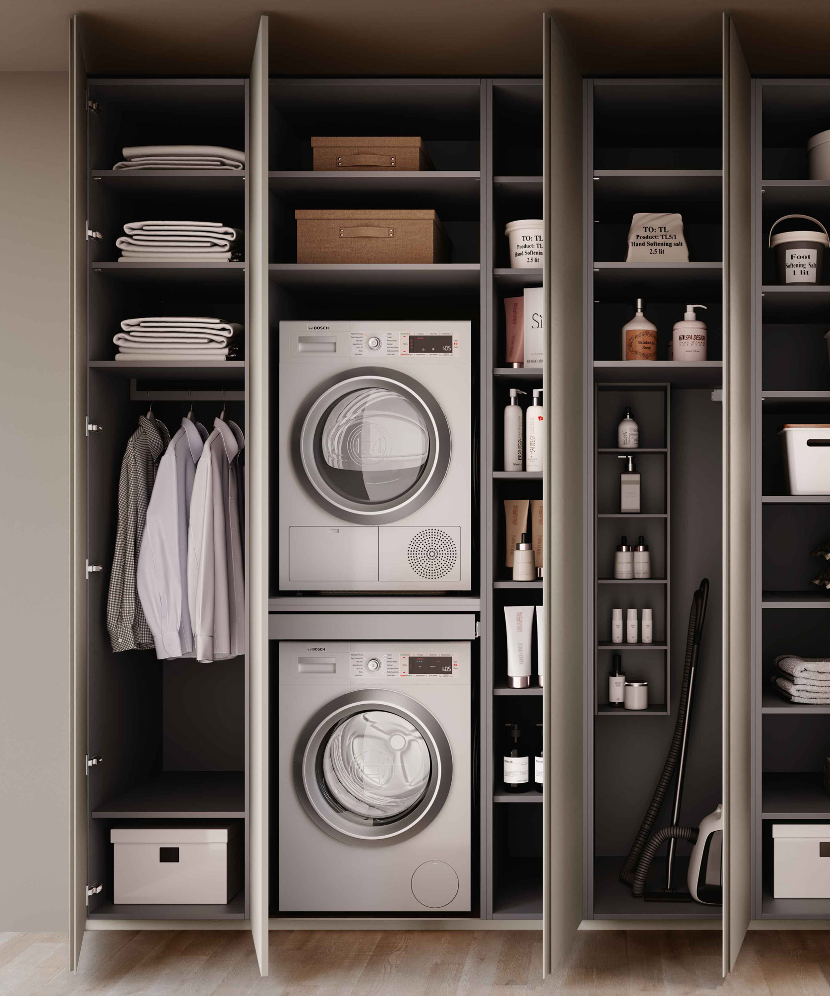 Compatto all’esterno, estremamente funzionale all’interno: questo armadio lavanderia a tutta altezza con 5 ante battenti è la soluzione ideale per organizzare al meglio gli spazi. L’apertura con gola esalta il design pulito, mentre l’attrezzatura interna modulabile permette di configurare ogni elemento in base alle proprie esigenze. Realizzabile su progetto in diverse misure, materiali e finiture, è perfetto per creare una zona lavanderia ordinata, discreta e su misura.