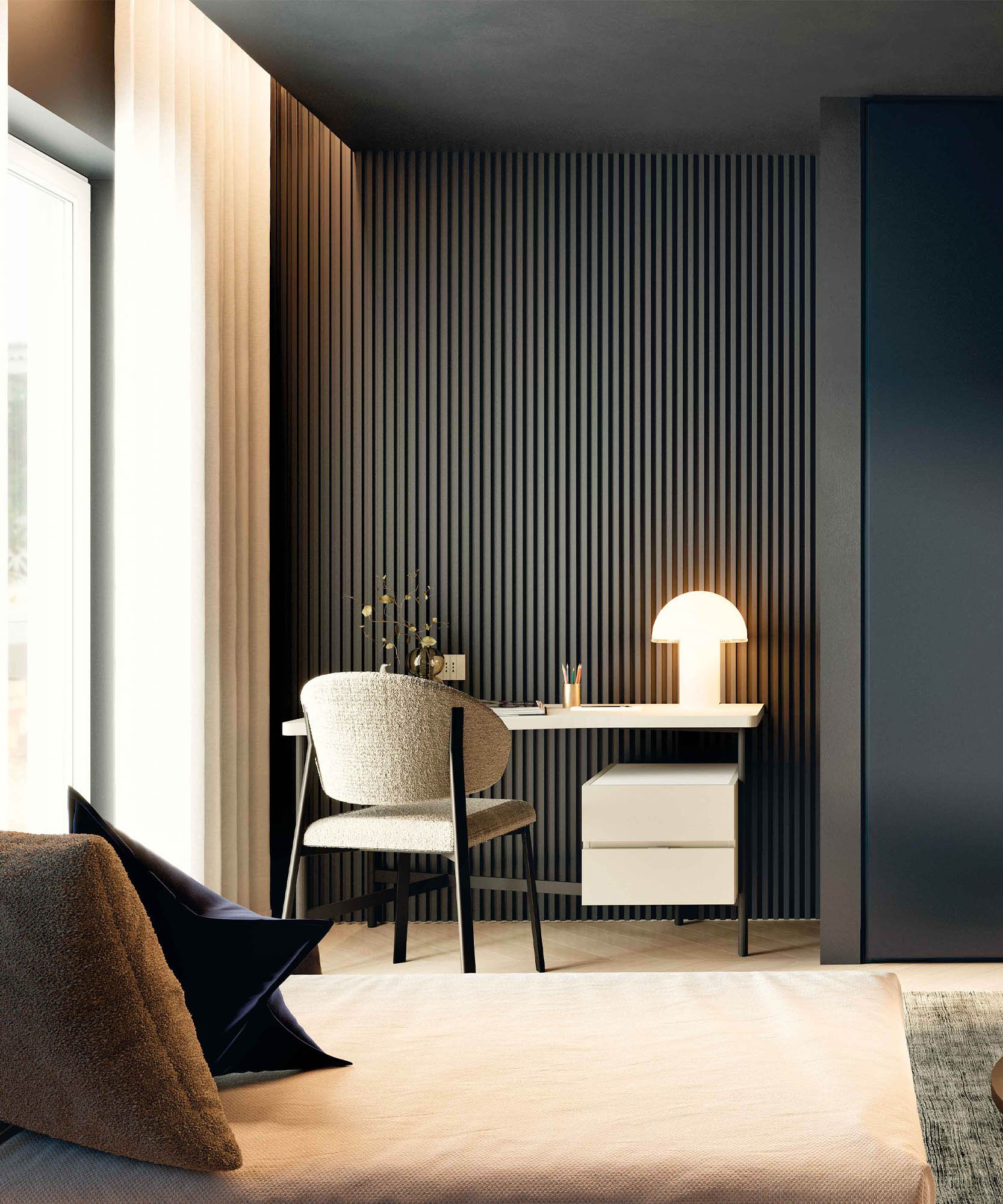 Rivesti la parete con stile grazie a una boiserie moderna con pannelli a doghe verticali lavorati con effetto cannettato. Il colore è personalizzabile per ottenere la stessa tinta della parete, dando vita a un effetto continuo, senza fughe né stacchi visivi. Disponibile su progetto e in diverse finiture, si adatta perfettamente a ogni ambiente, aggiungendo eleganza e profondità all’arredo.