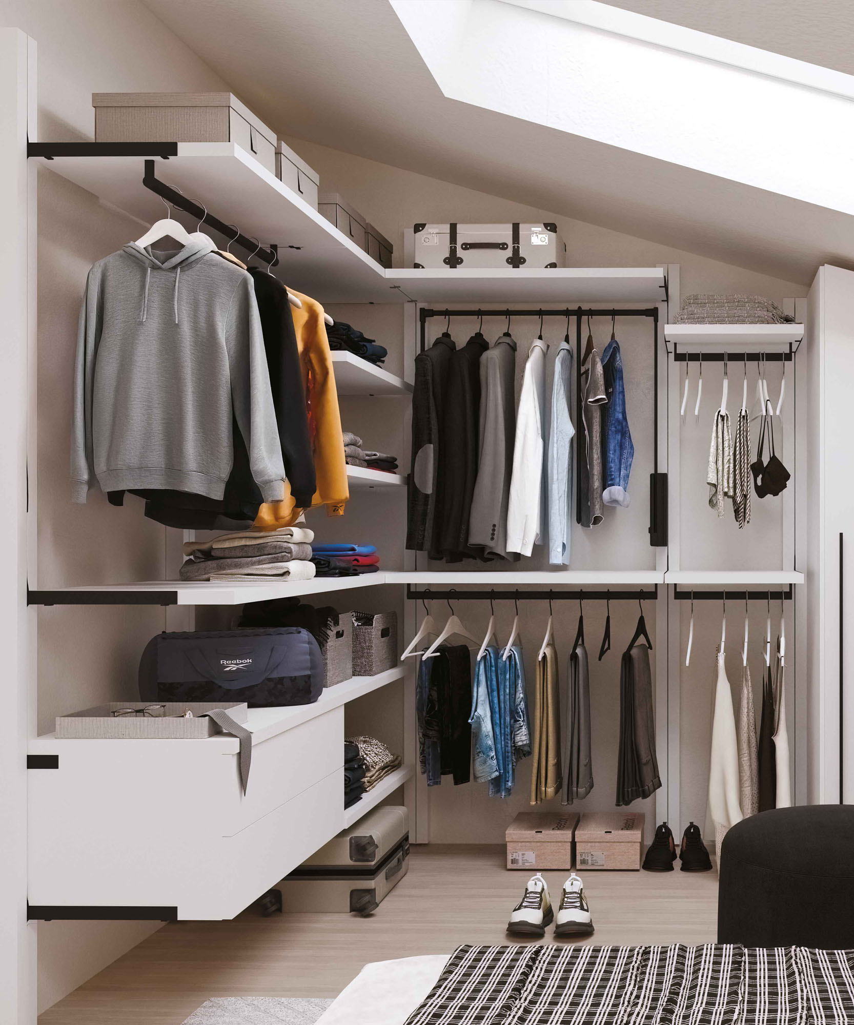 Un progetto d’arredo intelligente e su misura, pensato per sfruttare ogni centimetro con stile. La composizione ad angolo include una cabina armadio a cremagliera con montanti in alluminio, pannelli e ripiani in nobilitato supportati da eleganti strutture in metallo verniciato. Completano la struttura una cassettiera a 2 cassetti con apertura push-pull e tubi appendiabiti in alluminio verniciato.