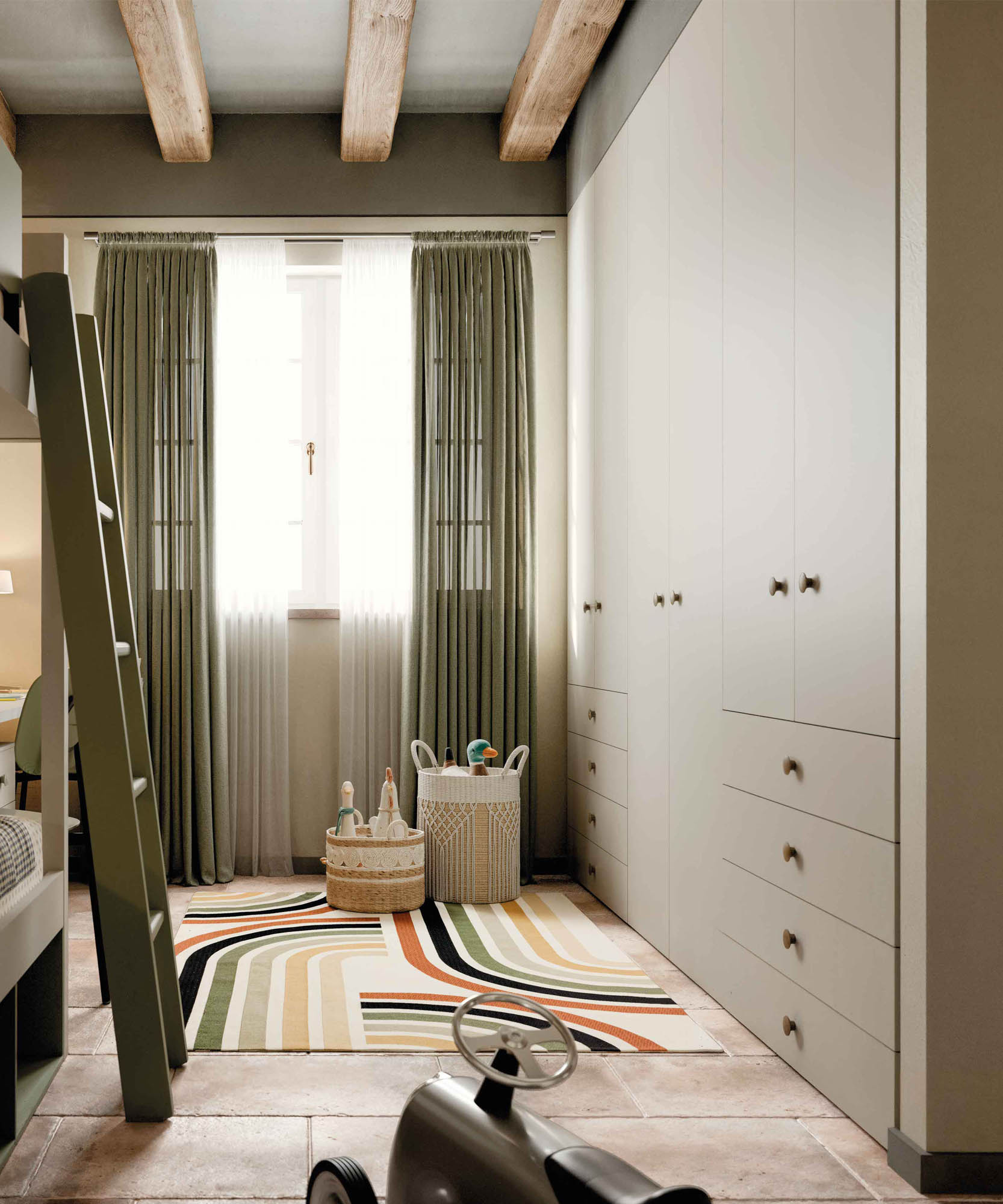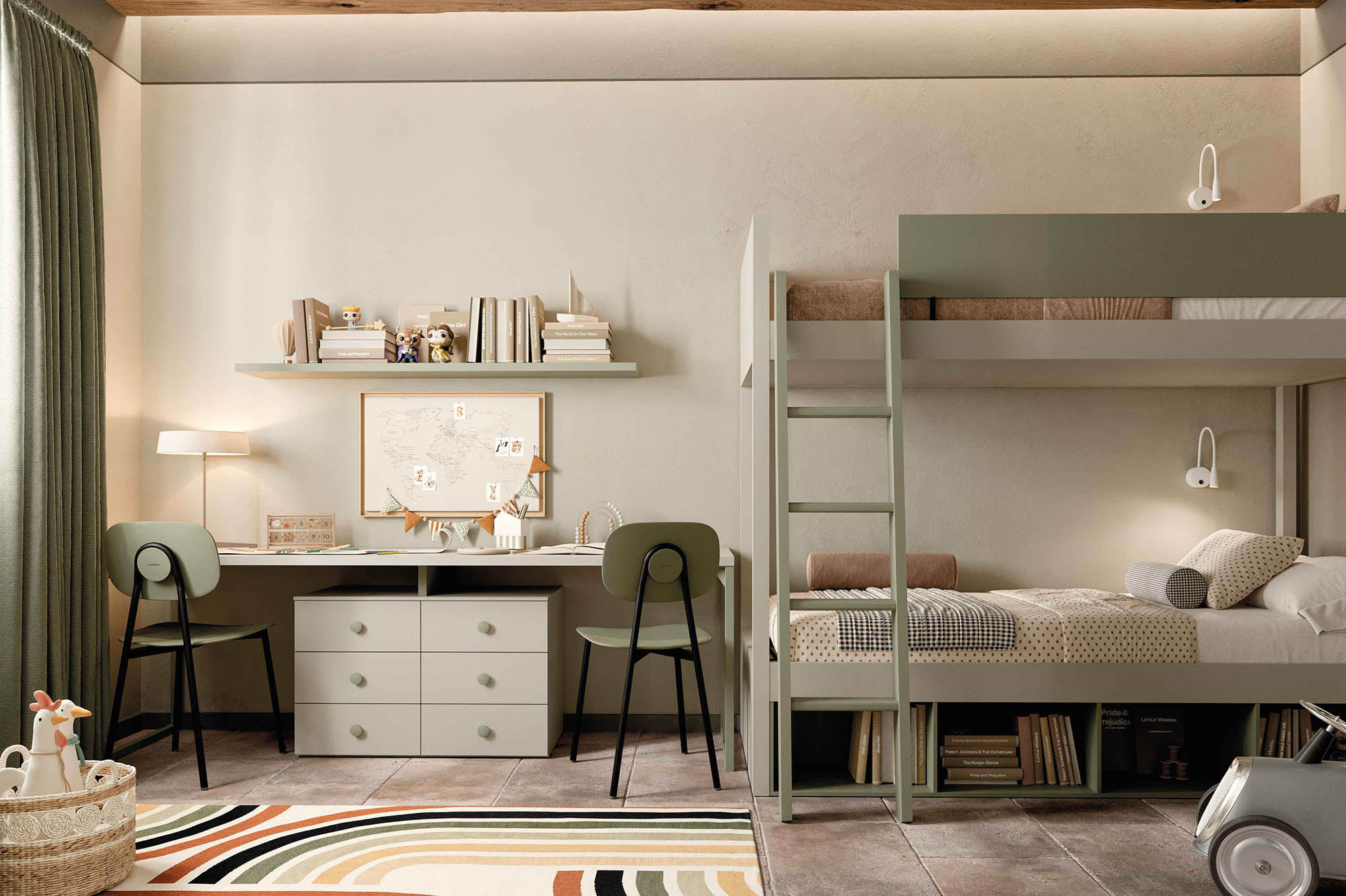 Una cameretta pensata per crescere insieme a chi la vive, dove ogni elemento è studiato per unire comfort e praticità. L’ampio armadio a 6 ante con doppia cassettiera organizza al meglio lo spazio, mentre il letto a castello in nobilitato, con salita frontale e protezione, crea una soluzione dinamica e funzionale. La libreria integrata e la scaletta in tinta aggiungono praticità e continuità estetica. La zona studio, con scrittoio e cassettiere, completa l’ambiente offrendo uno spazio dedicato a studio e creatività. Disponibile su progetto e in diverse finiture, si adatta facilmente a ogni esigenza. Esclusi materassi, mensola e sedie.