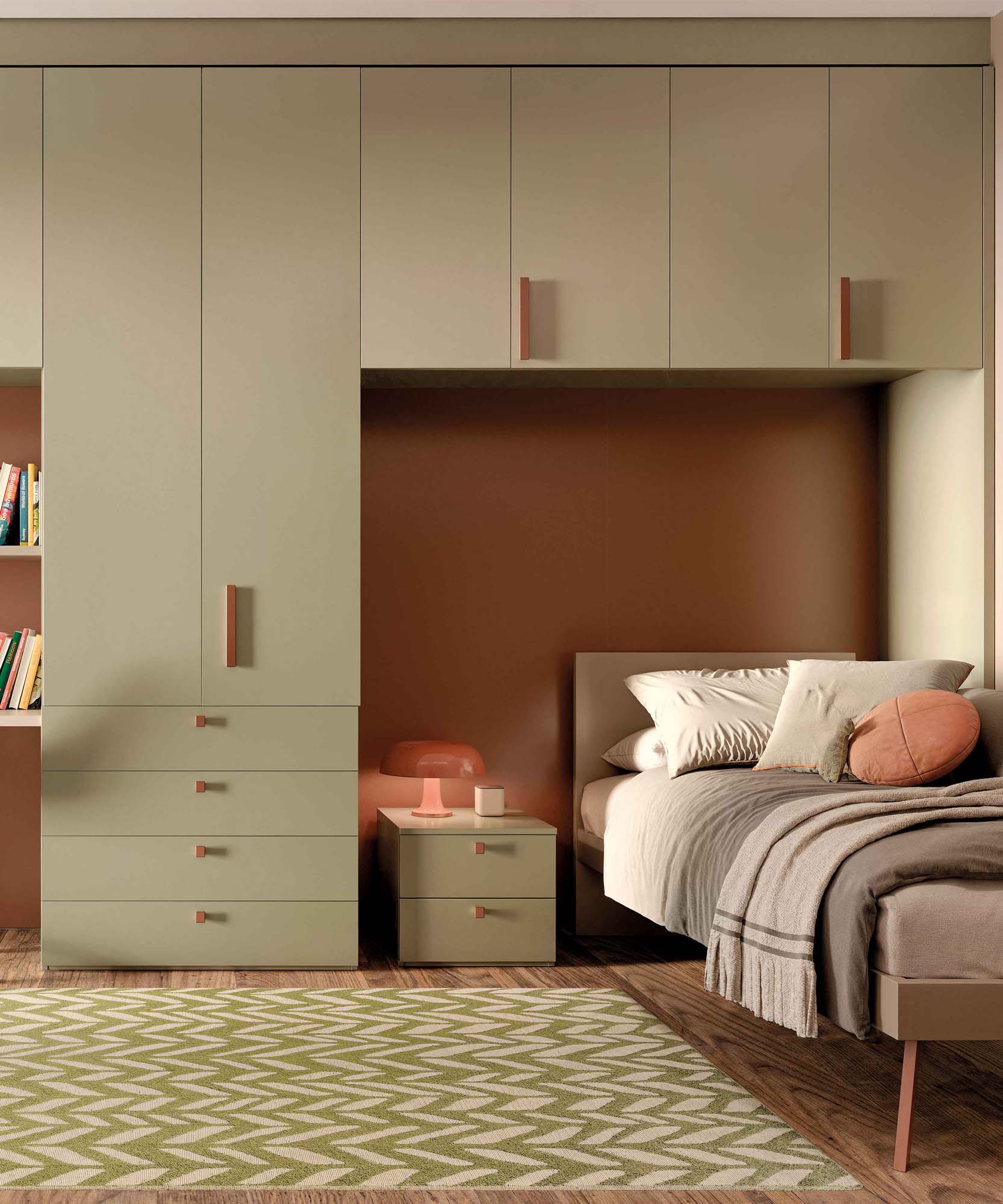 Progettata per accompagnare la crescita e le esigenze quotidiane, questa cameretta con armadio a ponte in nobilitato unisce praticità e stile in un’unica soluzione. Gli spazi sono organizzati in modo intelligente grazie ai moduli contenitivi e alle cassettiere, mentre la zona studio con scrittoio e mensola crea un angolo dedicato a studio e creatività. Linee pulite, volumi ben distribuiti e dettagli funzionali rendono l’ambiente accogliente e ordinato. Disponibile su progetto e in diverse finiture, è la scelta ideale per una cameretta versatile e sempre attuale.