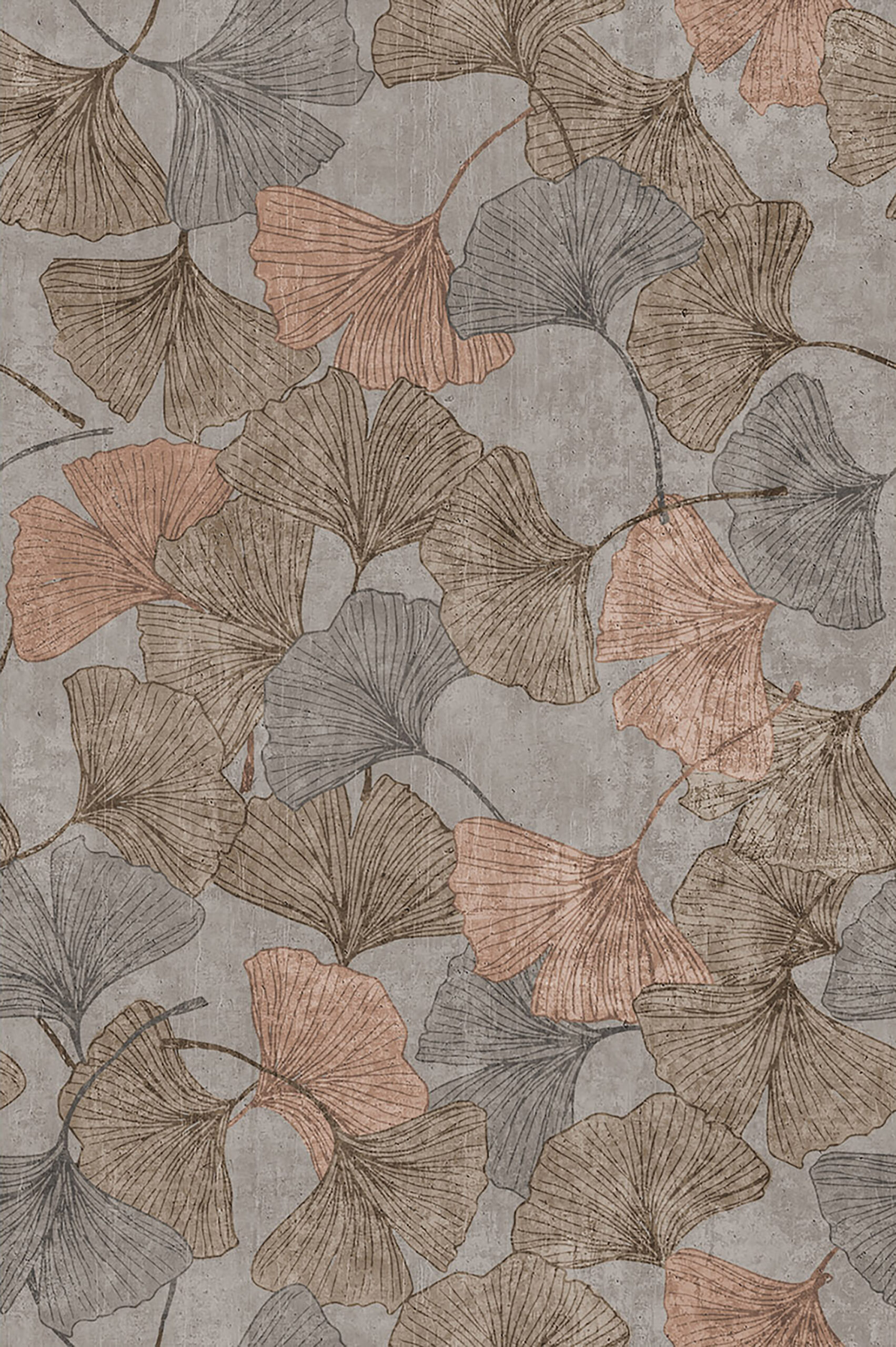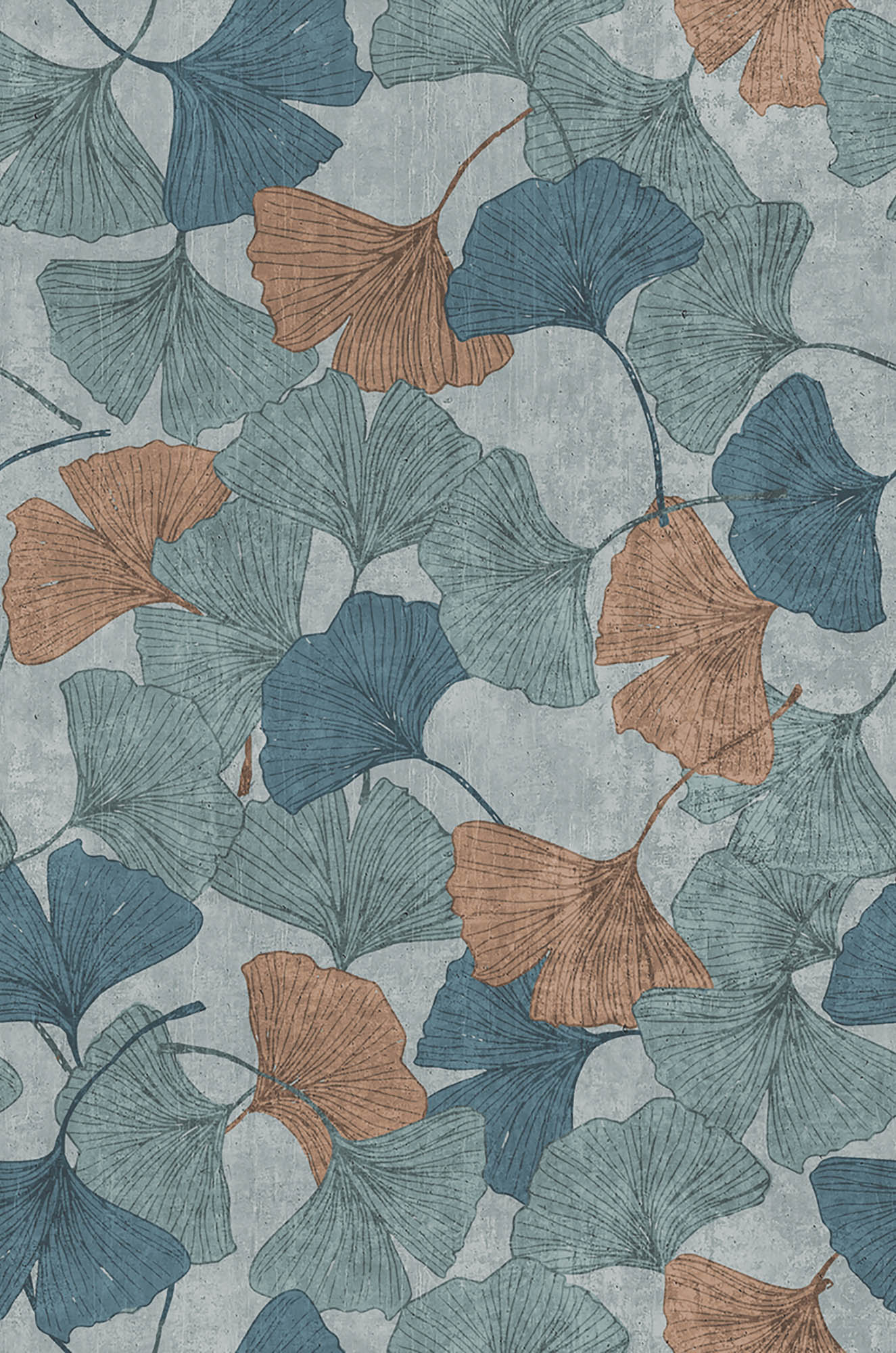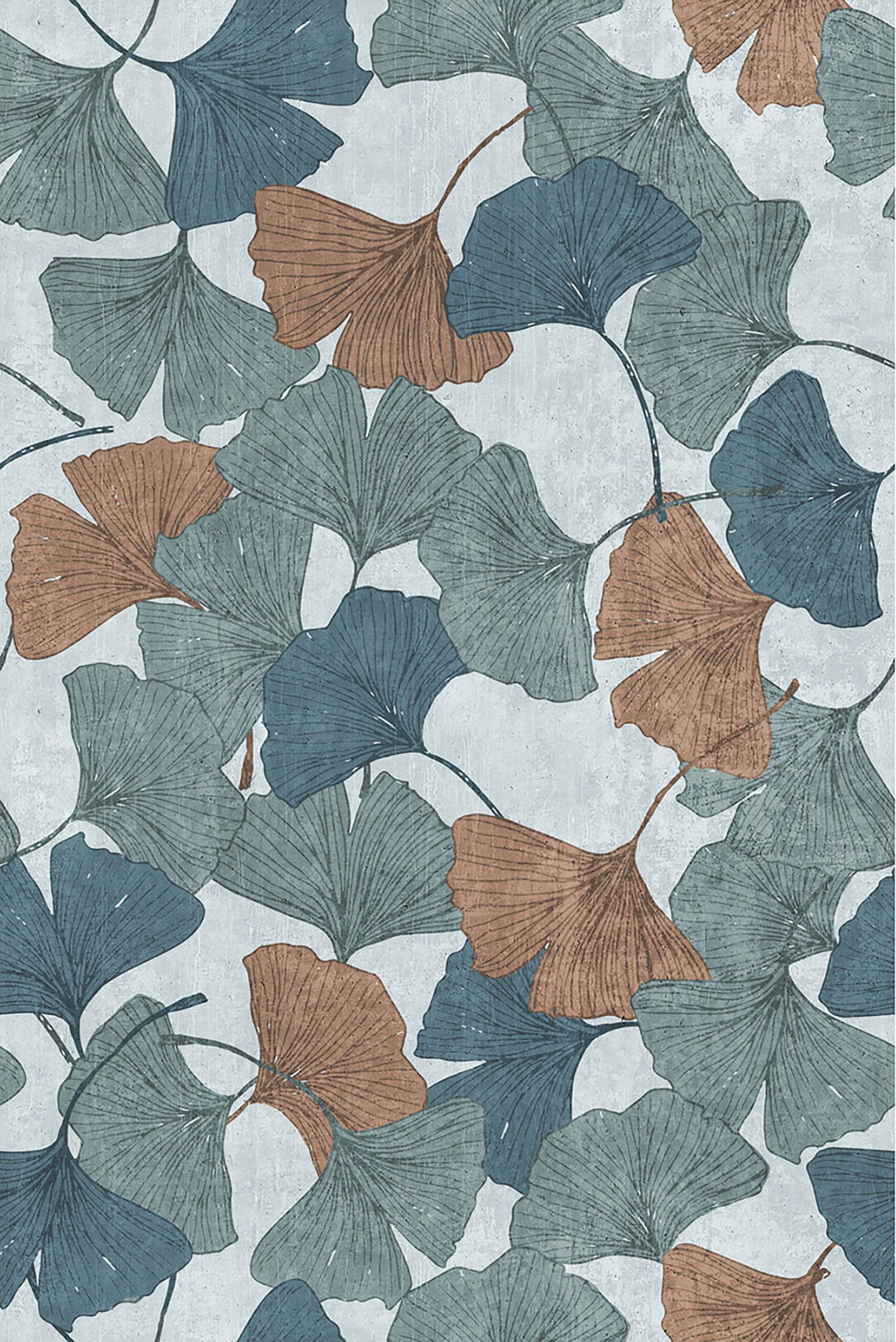 Design e natura si incontrano in questa carta da parati in vinile dal carattere moderno. Le grandi foglie di ginkgo, disegnate con linee grafiche essenziali, si intrecciano in un motivo che dona movimento e armonia alla parete. Le tonalità calde del rame e del tortora si fondono con sfumature di azzurro e grigio, creando un effetto rilassante e attuale. Perfetta per la camera da letto o la zona living, aggiunge personalità e stile a spazi dal gusto contemporaneo.