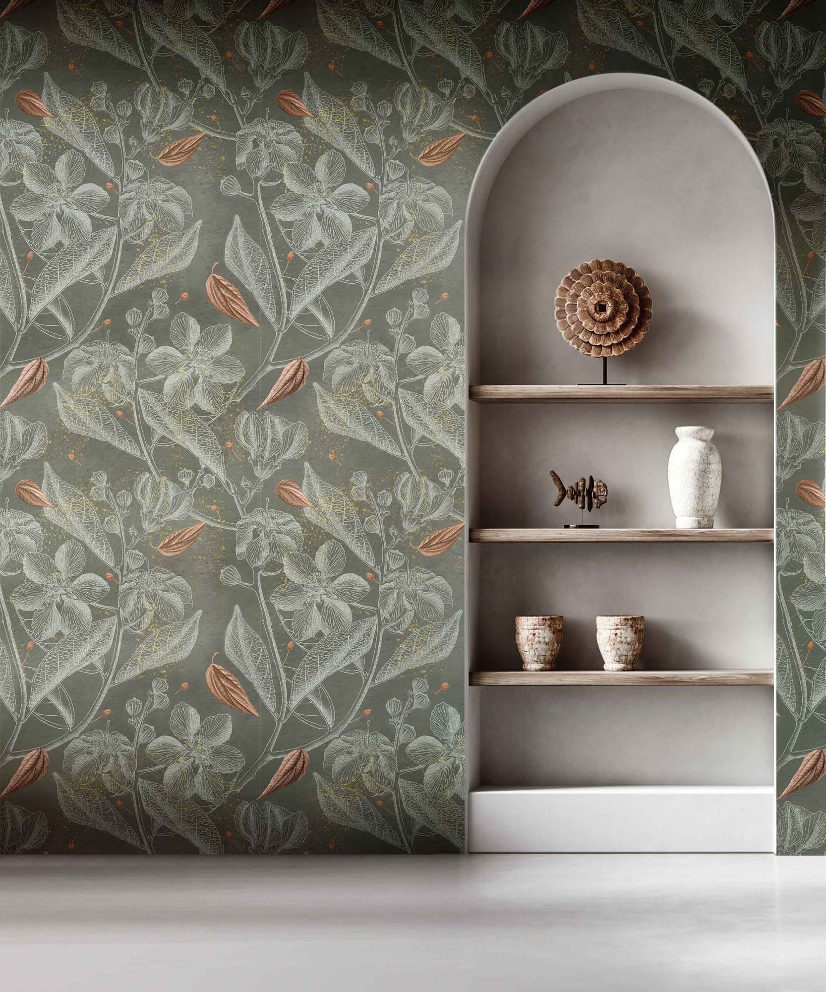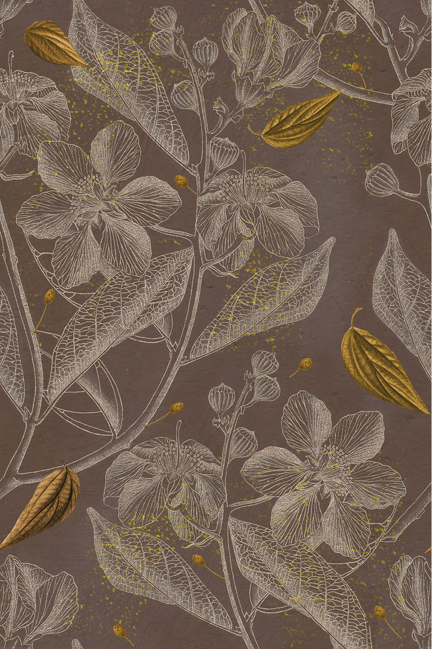 La bellezza della natura incontra l’eleganza del design in questa carta da parati in vinile dal fascino raffinato. Le foglie e i fiori disegnati con tratti sottili si intrecciano su uno sfondo materico, mentre gli accenti dorati donano luminosità e profondità all’insieme. Perfetta per creare atmosfere accoglienti e sofisticate, si adatta con stile a living moderni, zone studio o camere da letto ricercate. Una scelta decorativa che aggiunge calore e personalità a ogni ambiente.