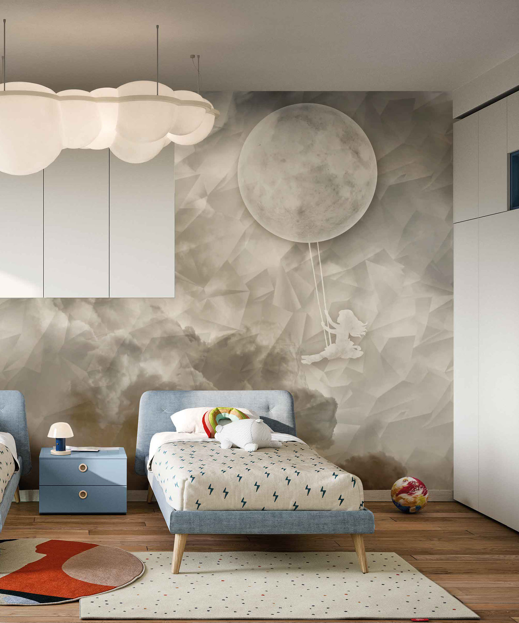 La carta da parati in vinile Moon Light trasforma la parete in un racconto magico: una bambina che dondola verso la luna, circondata da nuvole leggere e riflessi morbidi. Le tonalità neutre e sfumate donano eleganza e profondità, creando un effetto rilassante e avvolgente. Ideale per la cameretta o la zona notte, questa carta da parati aggiunge un tocco poetico agli interni contemporanei. Il materiale vinilico, lavabile e resistente, garantisce una resa impeccabile nel tempo, con tutta la praticità di un rivestimento di qualità.
