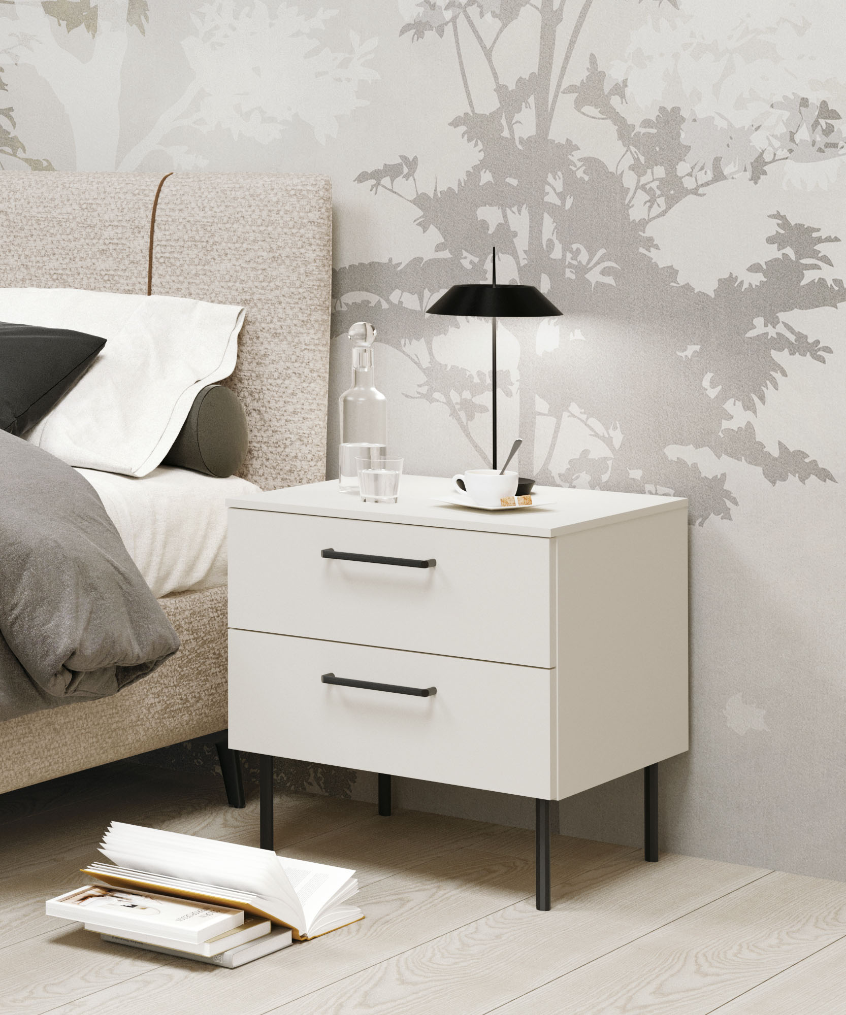 Comodino a 2 cassetti in nobilitato, con apertura a maniglia e piedi in metallo verniciato che donano un tocco moderno e leggero alla struttura. Linee essenziali e materiali resistenti lo rendono una scelta pratica e versatile per la zona notte. Disponibile in varie misure e finiture per adattarsi con stile a ogni ambiente.