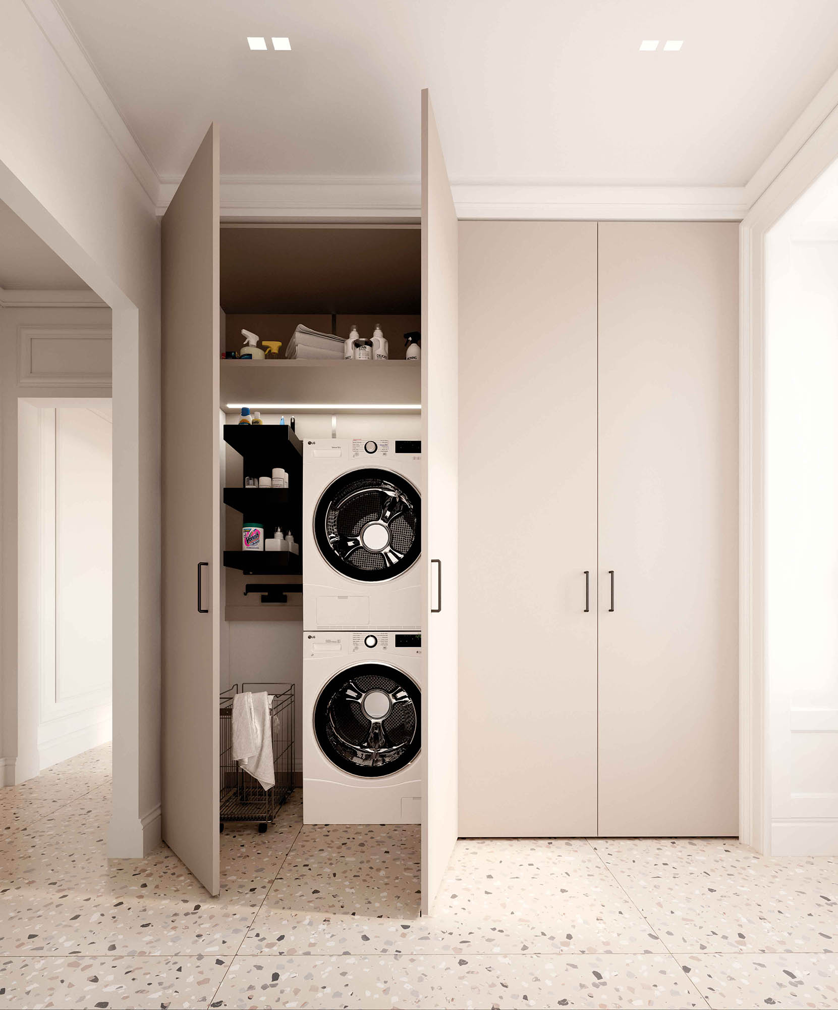 Pratica e ben organizzata, questa composizione lavanderia in nobilitato con 4 ante battenti e maniglie nere è pensata per ottimizzare lo spazio. Il modulo sinistro ospita lavatrice e asciugatrice sovrapposte ed è completo di vassoi, portascope e cesto biancheria su ruote. Il modulo destro è attrezzato con ripiani interni per una gestione ordinata. Disponibile su progetto e in diverse finiture, è ideale per una zona lavanderia funzionale e su misura.