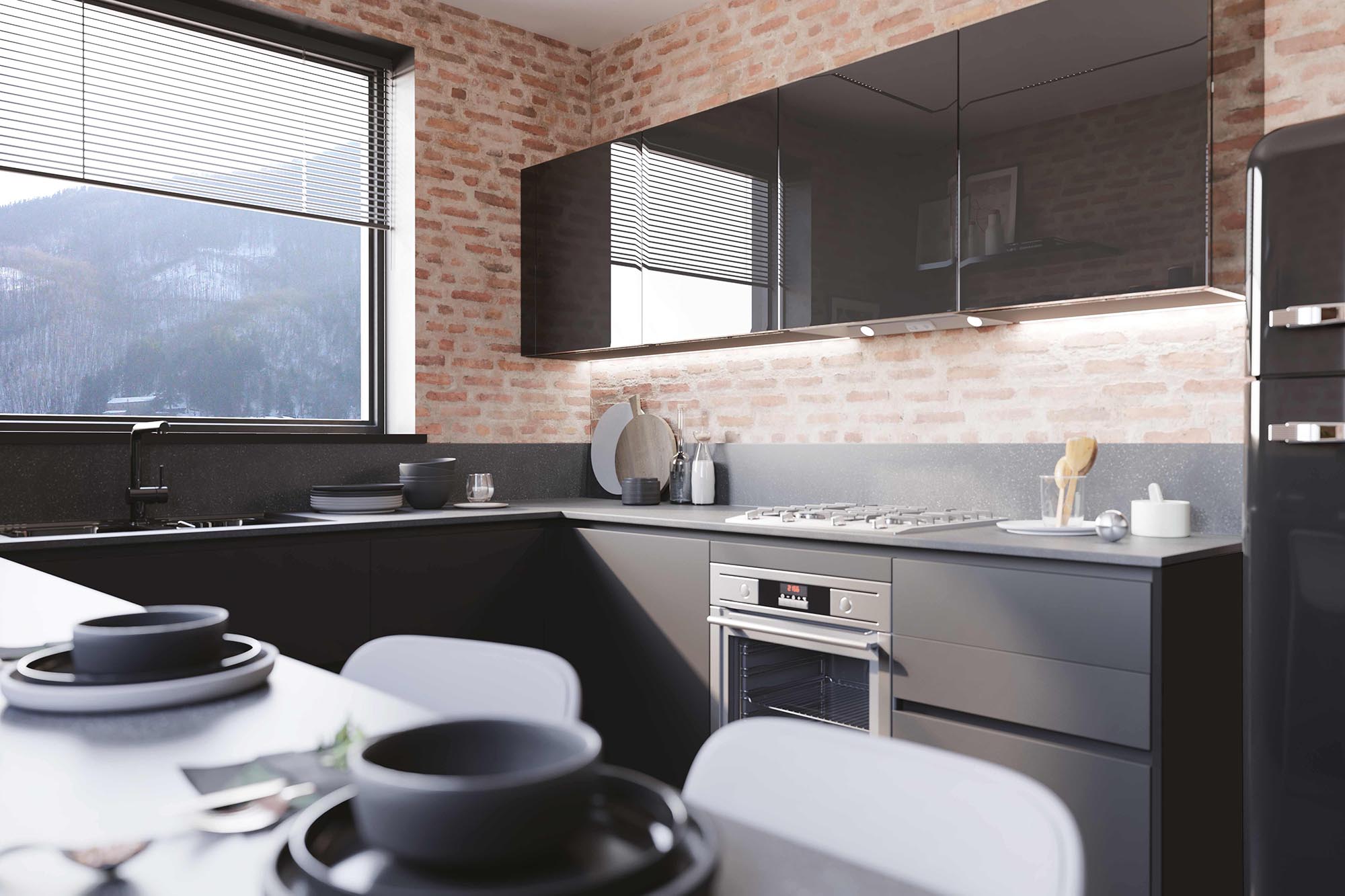 Cucina a doppio angolo dal carattere deciso, perfetta per ambienti stretti e lunghi a forma di “U”, dove ogni centimetro conta e lo stile fa la differenza. Le basi e i fianchi a terra in PET nero seta si fondono con pensili e mensole in laccato lucido nero, per un look elegante e di grande impatto visivo. Le gole in grigio lavagna e il top con spalla a terra aggiungono funzionalità e design, mentre gli schienali in laminato e gli zoccoli coordinati completano l’insieme con coerenza e cura del dettaglio. Inserita in un ambiente con muri in mattoni a vista, questa cucina crea un contrasto moderno e suggestivo che valorizza ogni finitura. Inclusi kit elettrodomestici, cappa, lavello e miscelatore. Esclusi frigo, accessori e luci. Disponibile su progetto e in altre finiture.