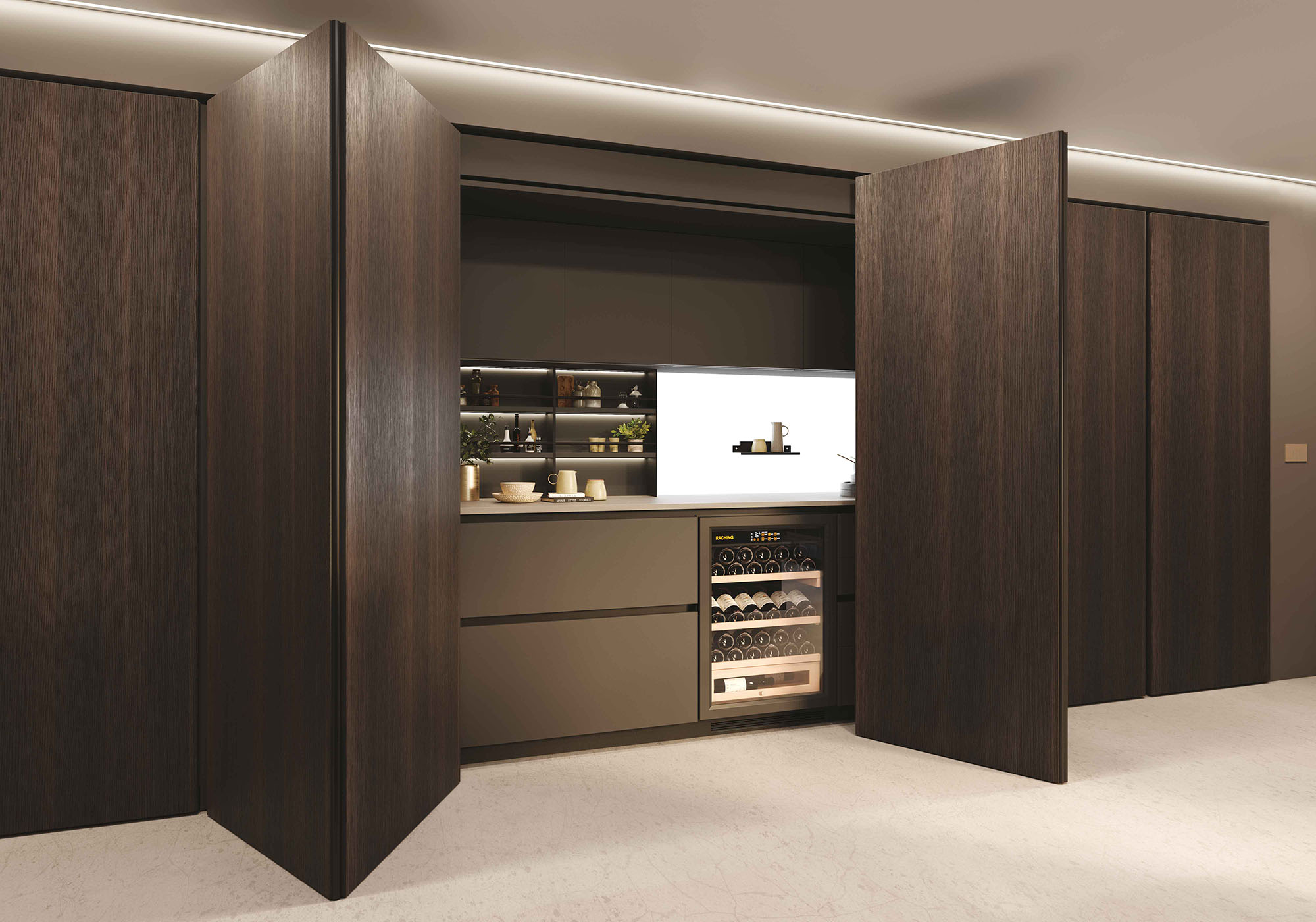 Cucina a isola dallo stile moderno e funzionale, con basi, top e fianchi a terra in elegante Fenix, apertura con gole e zoccoli coordinati per un effetto visivo pulito e contemporaneo. Il blocco colonne è composto da ante a terra in nobilitato effetto legno da 75 cm, con colonne esterne valorizzate da gole verticali integrate. Le ante centrali scorrevoli a scomparsa celano una seconda cucina lineare perfettamente integrata, con basi profonde 70 cm, colonna su misura, pensili, top coordinato e boiserie attrezzata. Lo schienale magnetico in vetro completa l’ambiente con accessori funzionali e di design. Una cucina su progetto, personalizzabile in finiture e dimensioni, ideale per chi desidera un ambiente elegante, organizzato e altamente performante.
