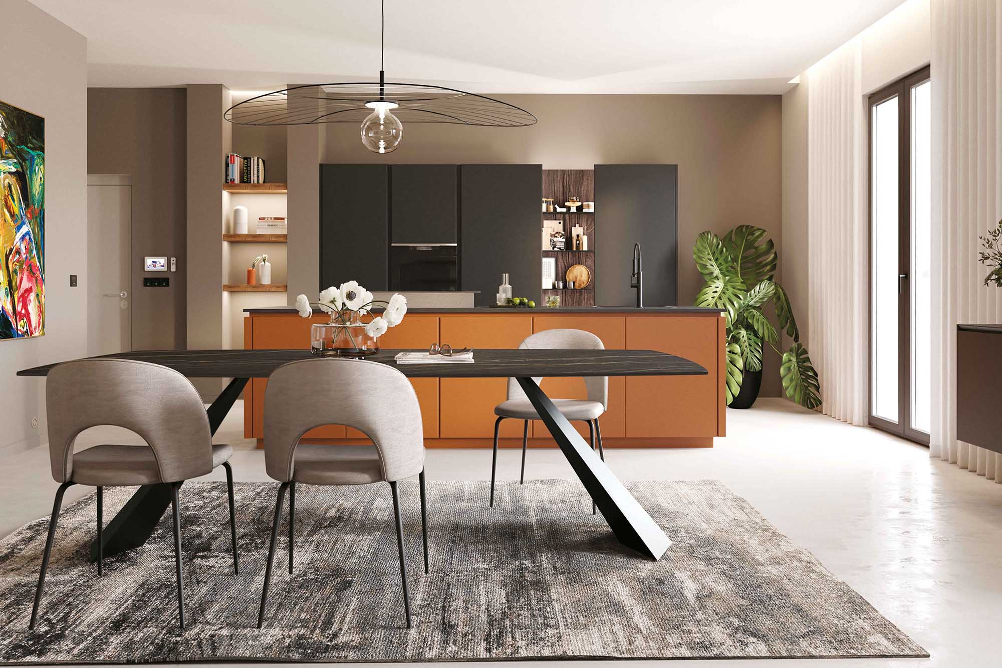 Cucina a isola dal design elegante e contemporaneo, con basi e fianconi terminali in laccato opaco che donano raffinatezza e continuità visiva. Le gole laccate in tinta e i top in laminato resistente esaltano uno stile curato in ogni dettaglio. Il blocco colonne, con ante a terra da 60 e 75 cm in PET e fianchi coordinati, unisce funzionalità e bellezza. La boiserie a terra, con pannello in nobilitato e mensole in HPL opaco, aggiunge carattere e versatilità alla composizione. Zoccoli in tinta con le gole per un look uniforme e sofisticato. Completa di kit elettrodomestici, lavello e miscelatore. Cappa e accessori esclusi. Progetto personalizzabile e disponibile in una varietà di finiture.