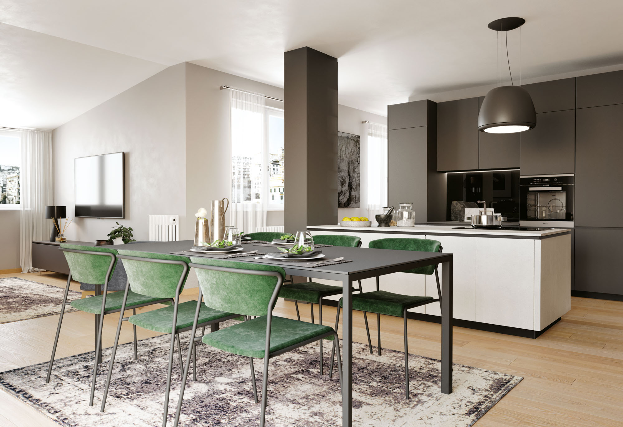 Cucina a isola dal carattere deciso e materico, con basi e fiancone in nobilitato effetto resina abbinati a top in laminato coordinato, per un look urbano e contemporaneo. L’apertura con gole grigio lavagna valorizza le linee pulite della composizione. Il blocco colonne, con basi, pensili e sovracolonne in PET nero seta, è completato da un top in Fenix nero e da maniglie integrate in metallo nero per un’estetica elegante e funzionale. Gli zoccoli in finitura grigio lavagna richiamano le gole e chiudono il progetto con coerenza cromatica. Inclusi kit elettrodomestici, lavello e miscelatore. Cappa, schienale in vetro, luci e accessori esclusi. Disponibile su progetto e personalizzabile in diverse finiture.