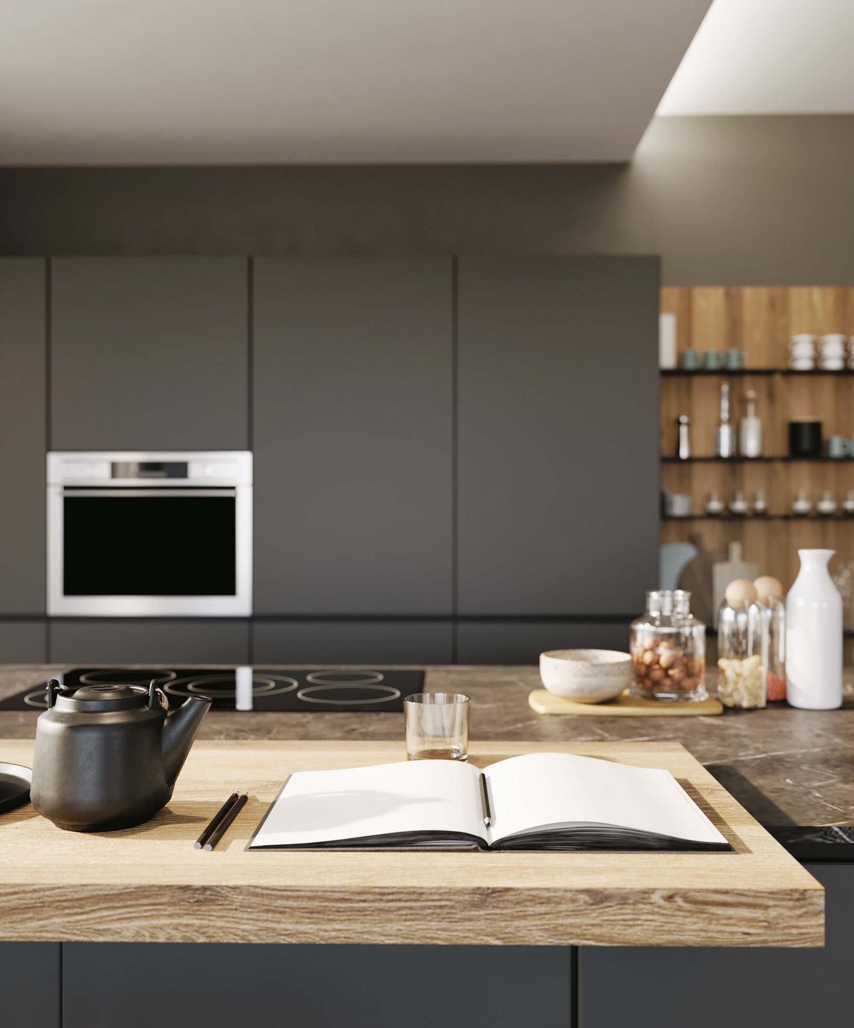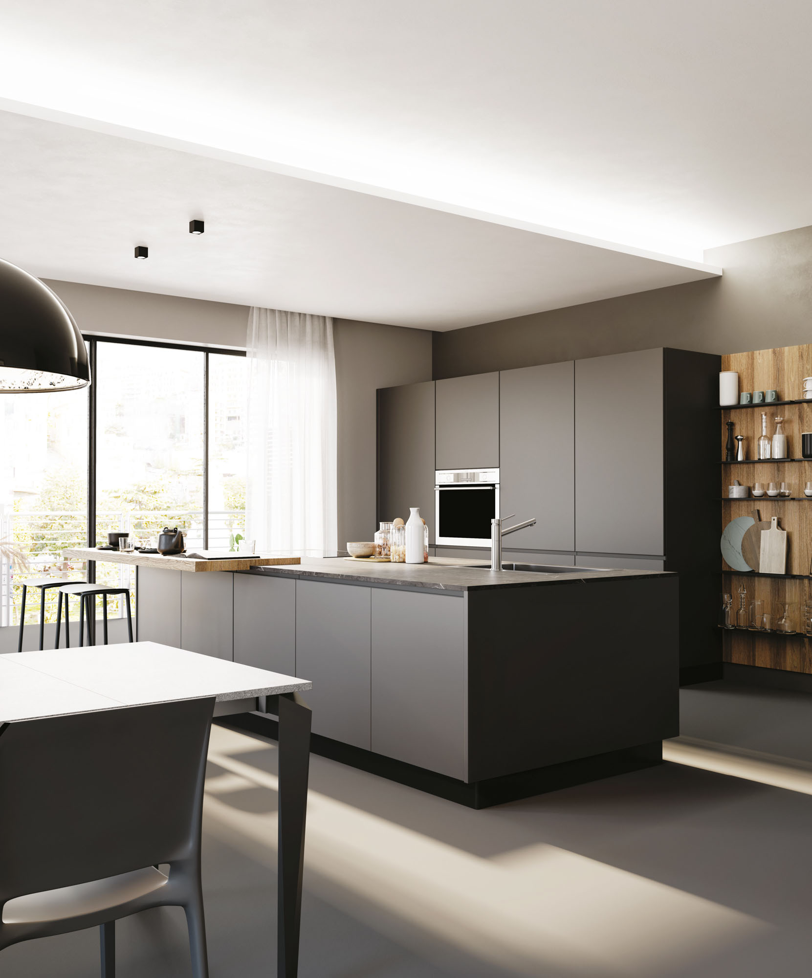 Cucina a isola dal gusto contemporaneo e sofisticato, con basi e fianchi laterali in PET seta grigio scuro che donano profondità e personalità all’ambiente. Il top in laminato effetto pietra valorizza lo stile materico della composizione, mentre il piano snack in laminato effetto legno aggiunge un tocco caldo e naturale. Le colonne da 75 cm per frigo, forno e dispense sono anch’esse in PET seta grigio scuro, per un effetto uniforme e avvolgente. Le maniglie integrate in metallo nero opaco sottolineano il design essenziale, mentre gli zoccoli in grigio lavagna completano l’estetica con coerenza. Inclusi kit elettrodomestici con frigo da 75 cm, lavello e miscelatore. Cappa e accessori esclusi. Disponibile su progetto e personalizzabile in altre finiture.