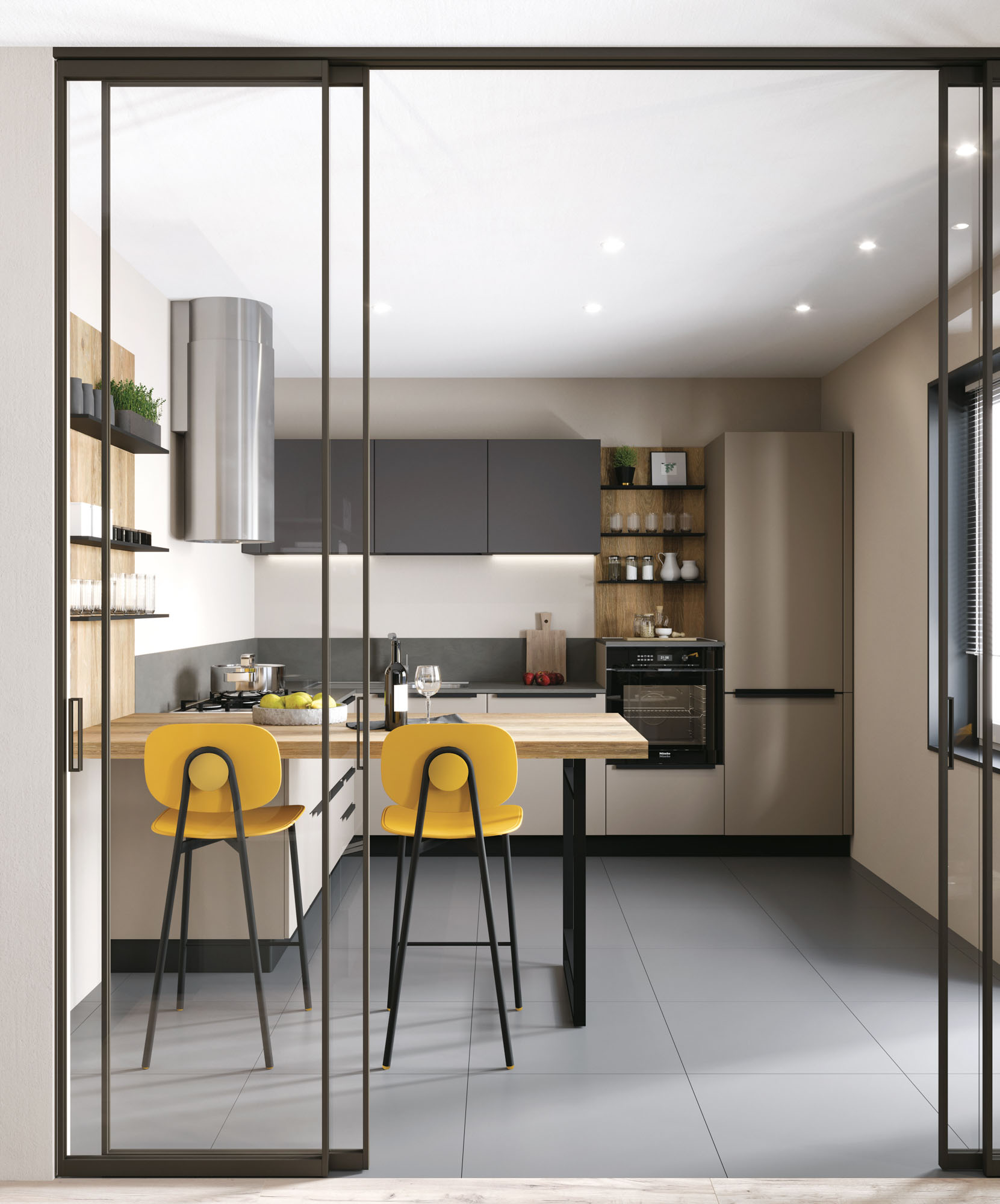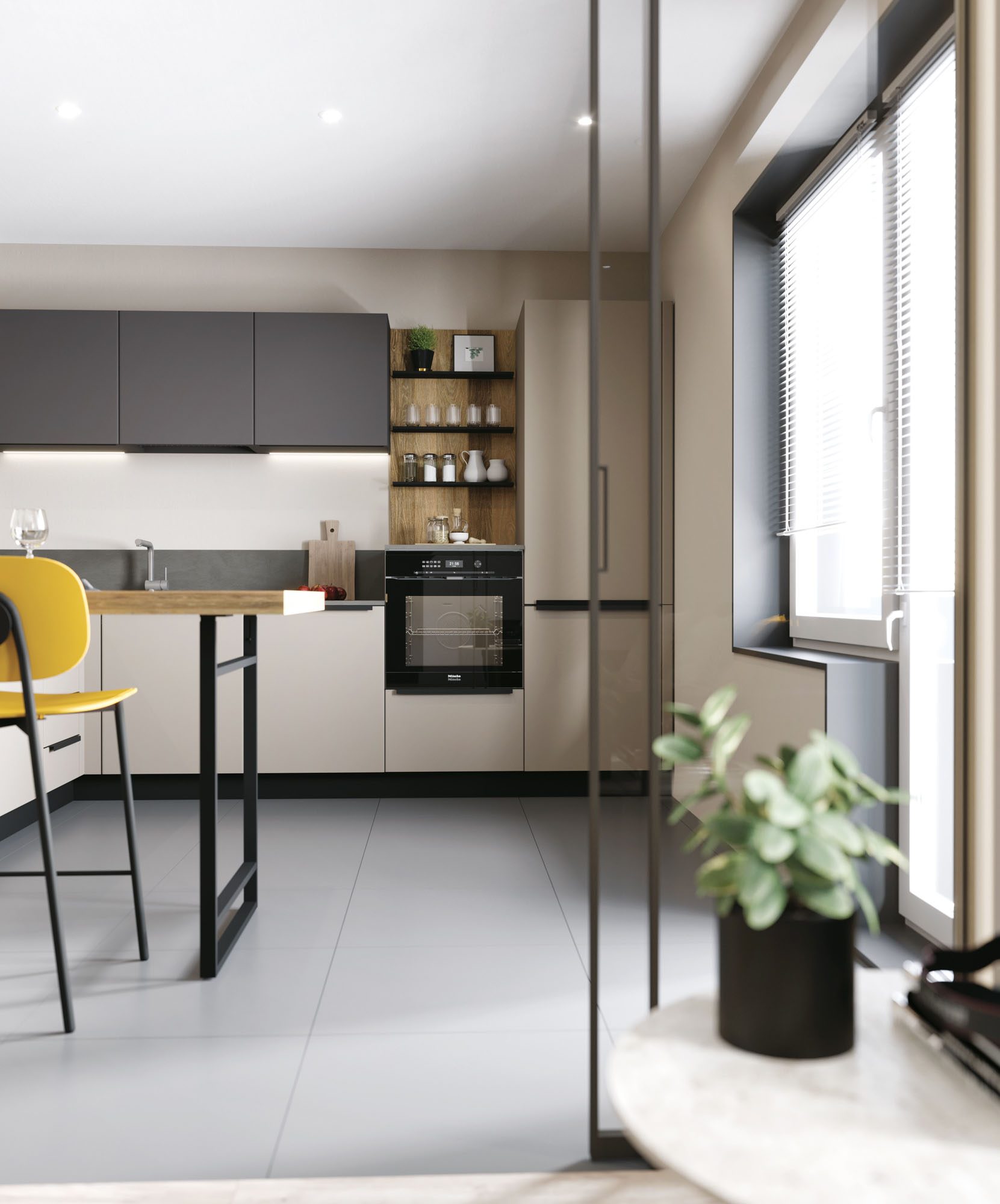 Cucina a penisola dal design elegante e contemporaneo, con basi e colonne in nobilitato grigio scuro e pensili in laccato opaco monofacciale coordinato. Le maniglie integrate in metallo nero sottolineano le linee pulite della composizione, mentre top e schienale in laminato grigio creano un effetto raffinato e uniforme. Il piano snack in laminato effetto legno, sorretto da una gamba in metallo nero supermatt, aggiunge un tocco di calore e modernità. Completa l’ambiente la presenza di due boiserie con pannelli in nobilitato effetto legno e mensole in HPL nero opaco, ideali per organizzare e decorare lo spazio con stile. Inclusi nel kit: elettrodomestici, lavello e miscelatore. Sono esclusi cappa e accessori. Disponibile su progetto e personalizzabile in numerose finiture per adattarsi perfettamente al tuo stile.