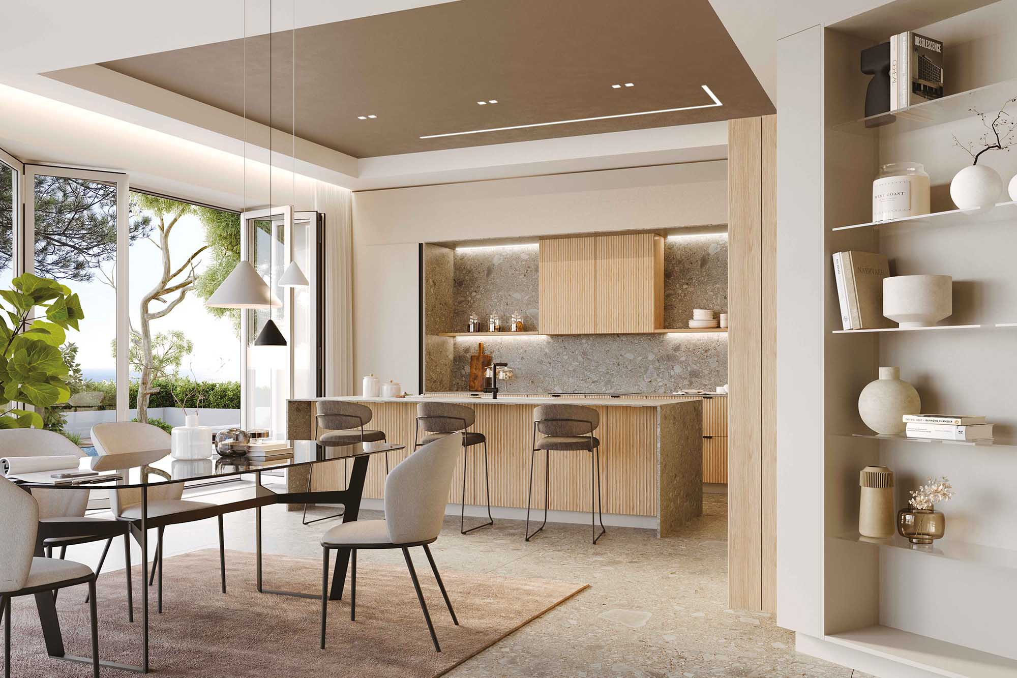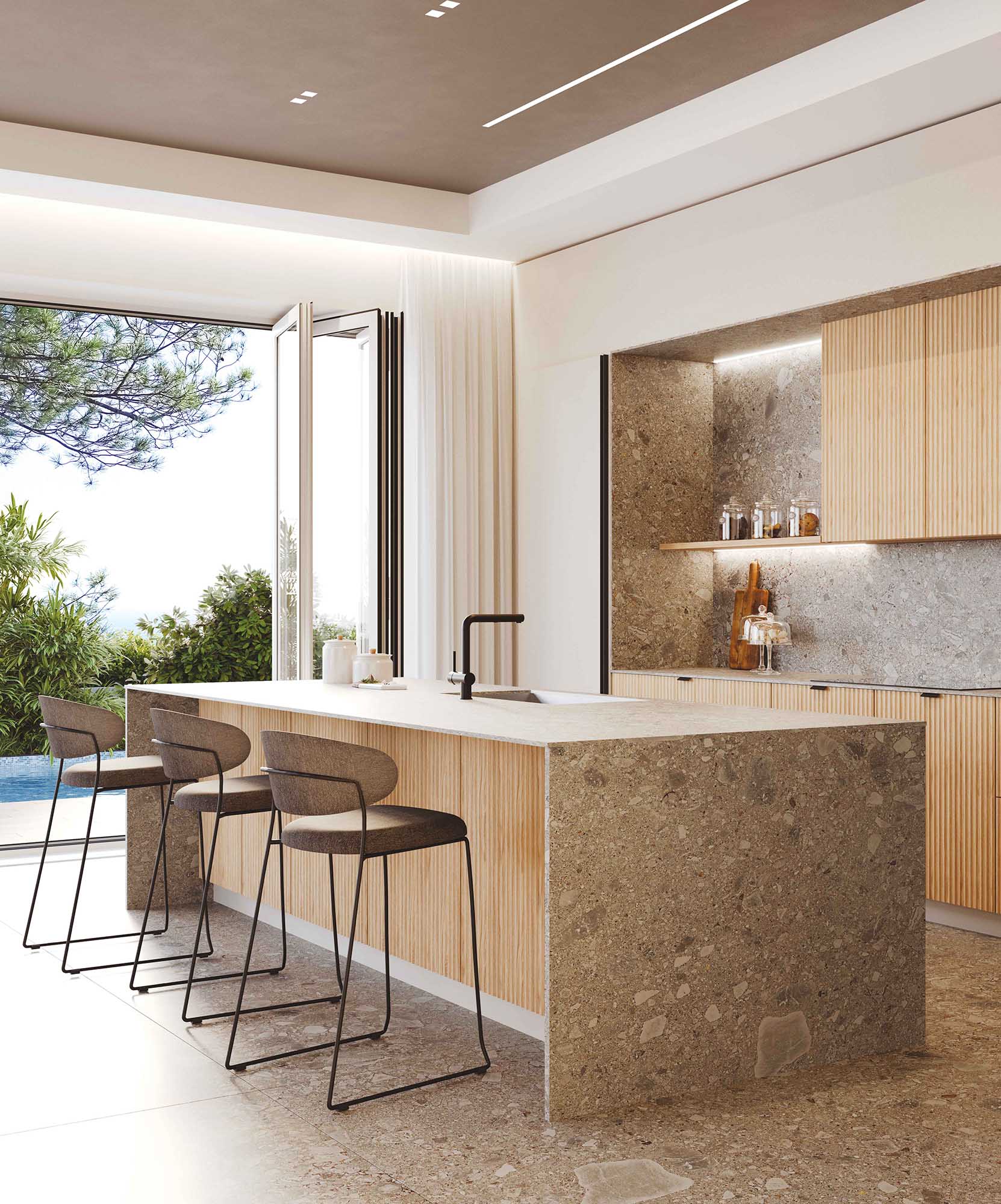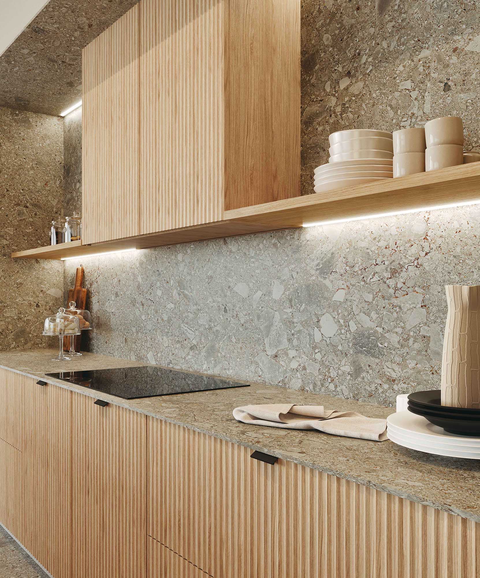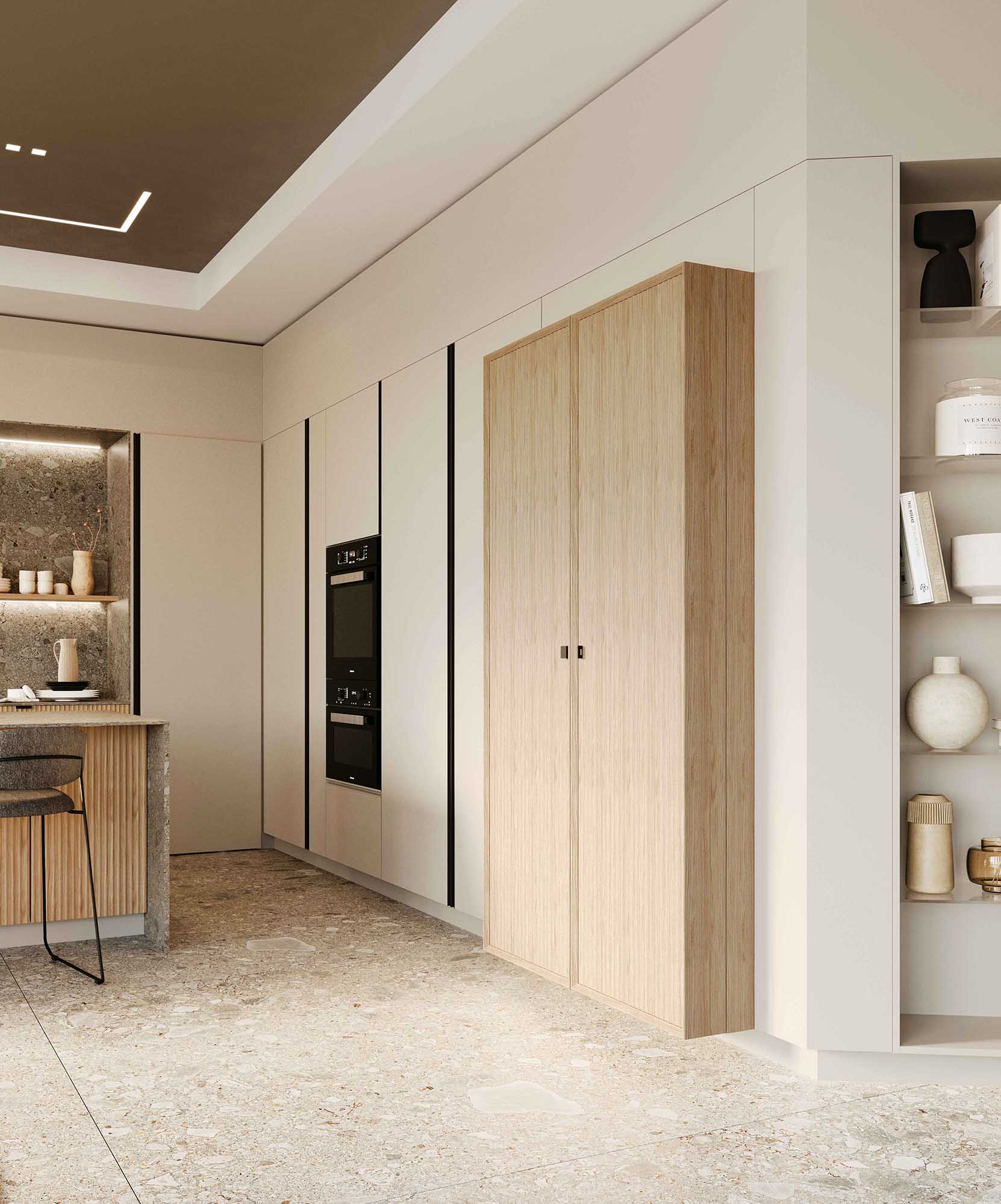Cucina su misura dal carattere sartoriale, pensata per chi cerca eleganza e matericità. L’isola, con ante Cannettate in legno e top in pietra, si distingue per la sua presenza scenica e la qualità dei materiali. La composizione lineare abbina basi con maniglie a pensili con ante Cannettate e mensole a giorno, mentre top e schienale in pietra mantengono coerenza stilistica. Le colonne in laccato opaco con gole si integrano con un armadio sporgente attrezzato con cantina vini e ante lavorate, completato da un mobile terminale con mensole in vetro. Gole e zoccoli in tinta donano continuità e raffinatezza. Disponibile su progetto e personalizzabile in una varietà di finiture.