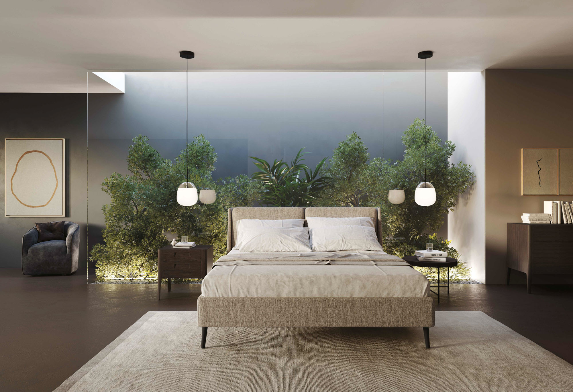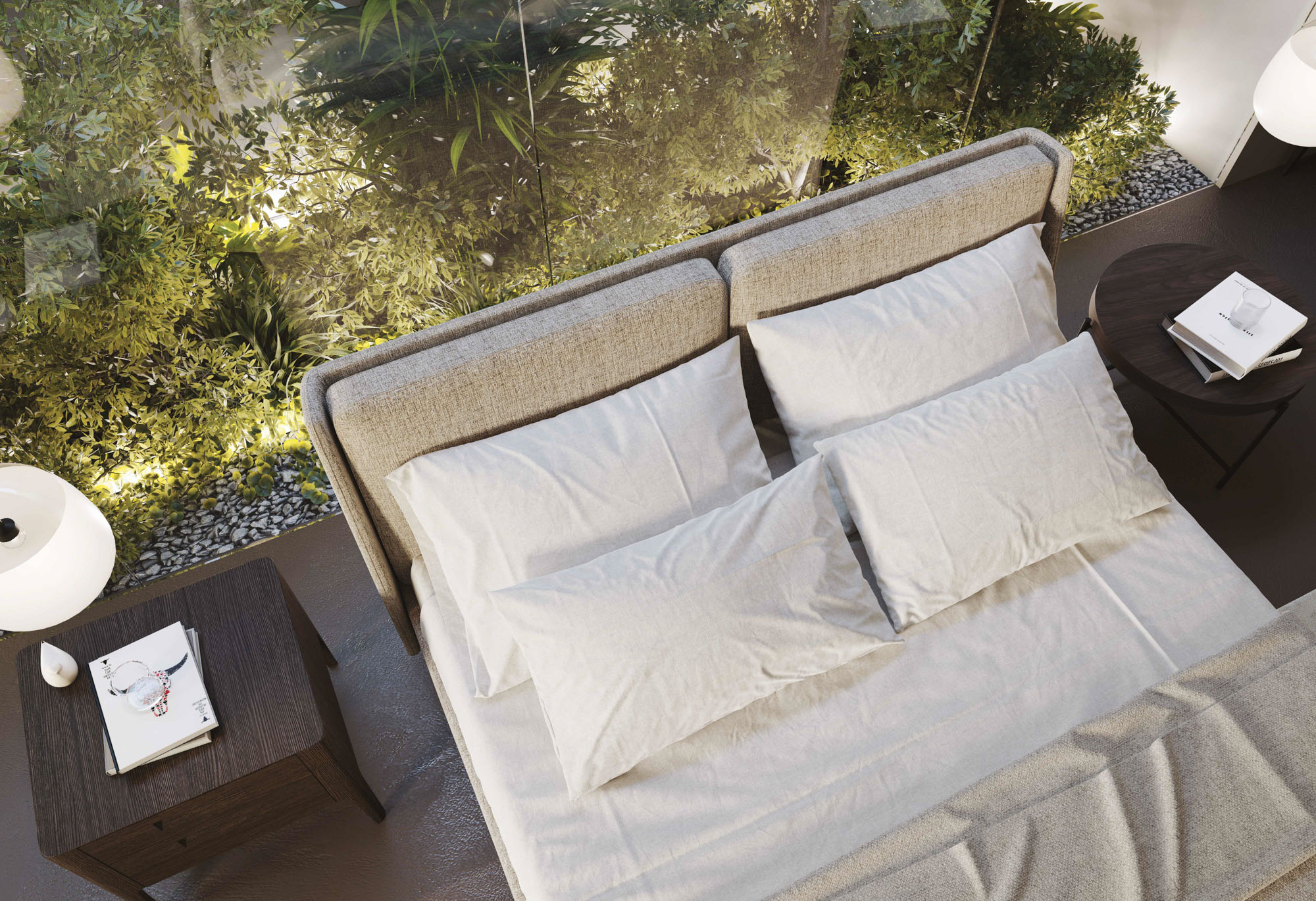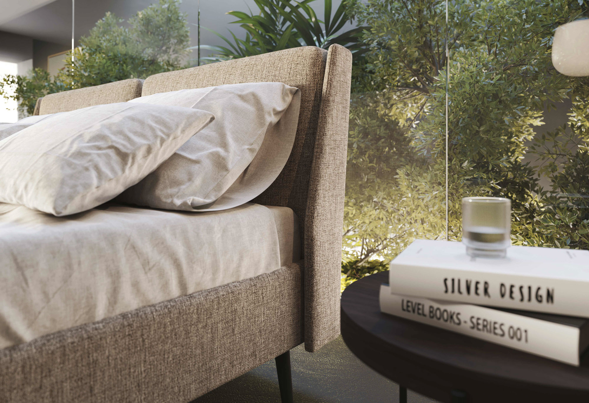 Letto matrimoniale in tessuto sfoderabile con rete a doghe in legno e testiera con cuscini, offre uno stile unico e un comfort aggiuntivo. I piedi in legno con finitura wengé donano un tocco elegante e moderno. Disponibile in diverse misure, finiture e anche nella versione con box contenitore. Escluso materasso.