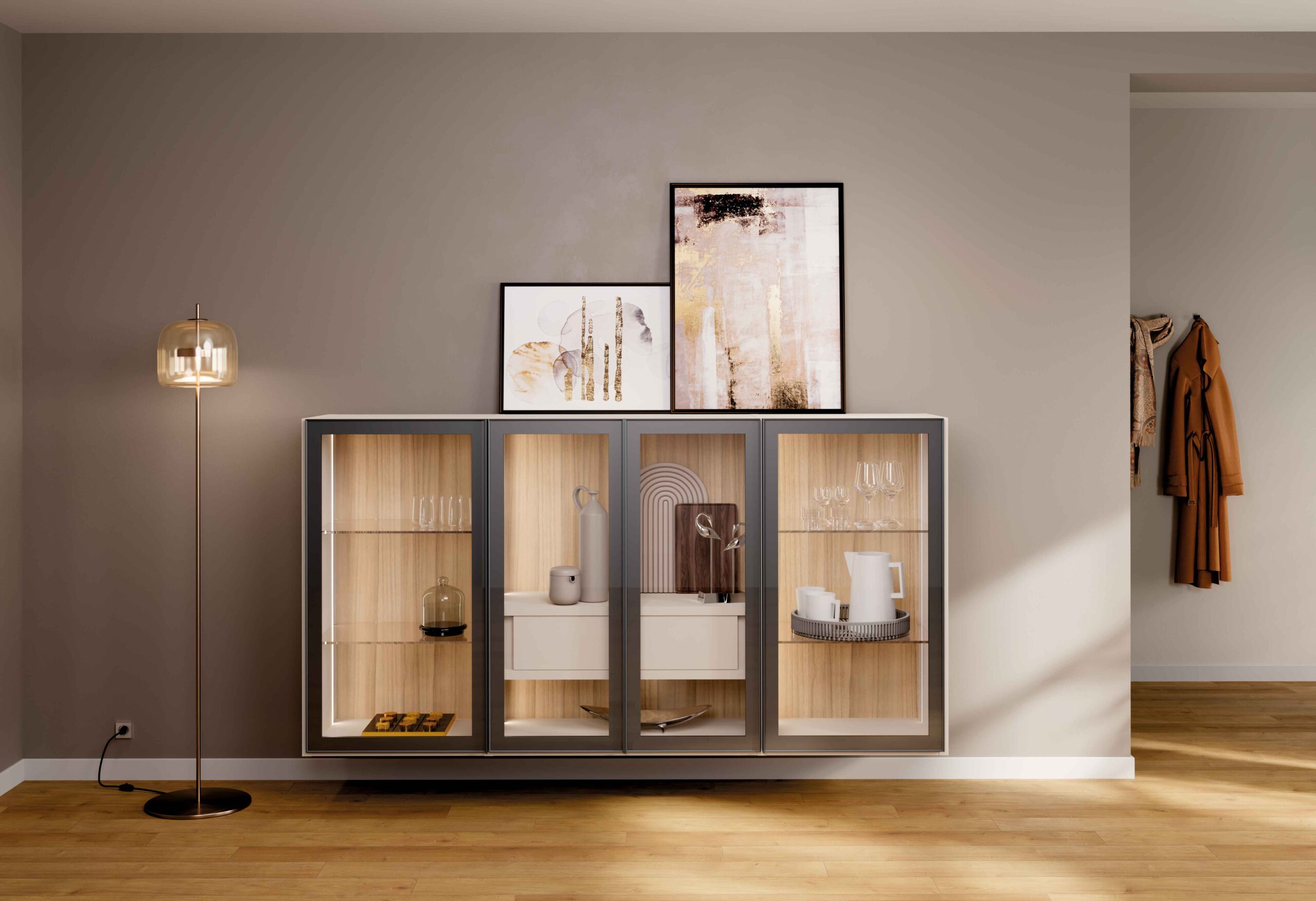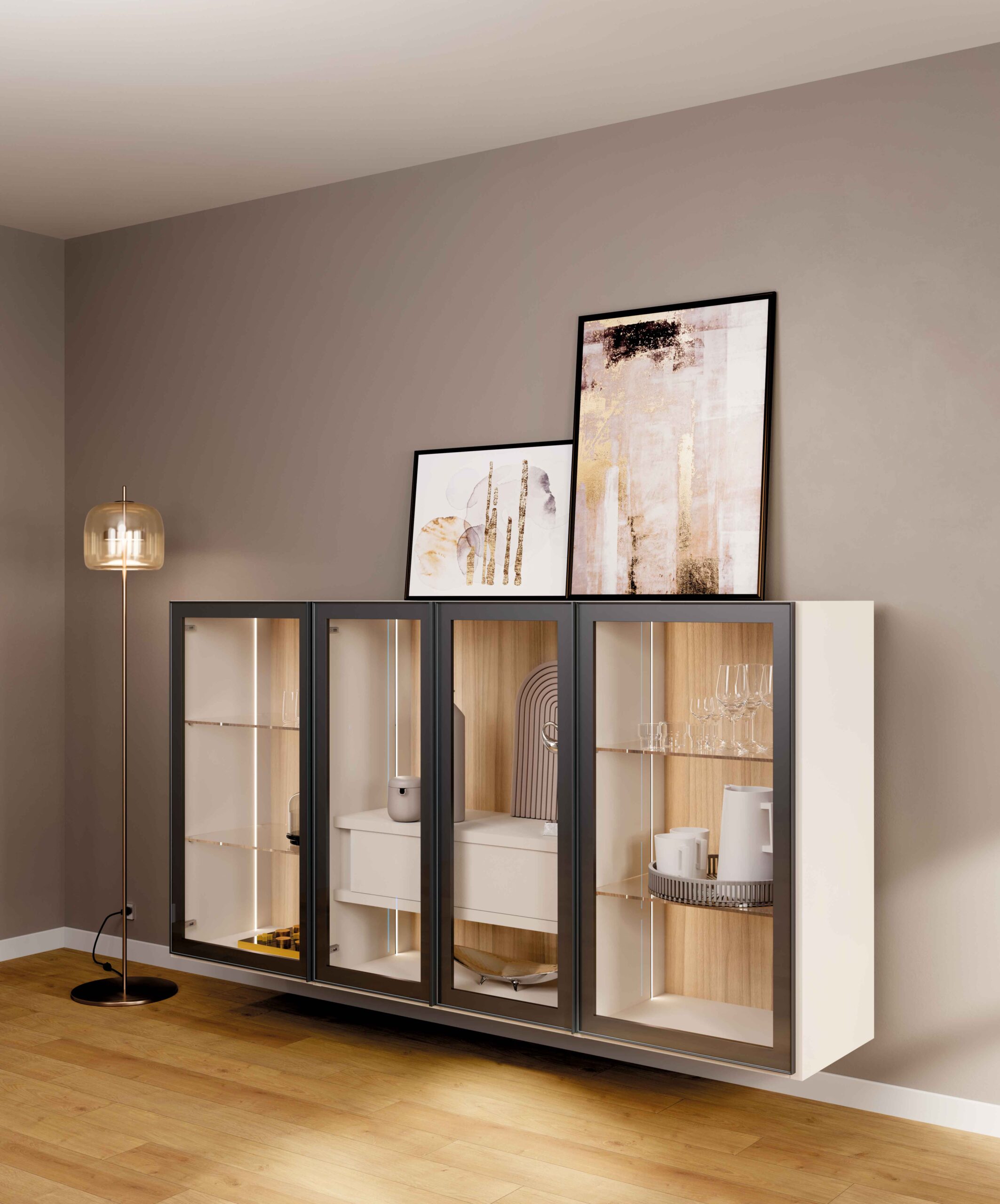 Un sistema componibile pensato per valorizzare il soggiorno con eleganza e trasparenze. Questa madia sospesa è caratterizzata da ante battenti con telaio in metallo verniciato grigio effetto lavagna e vetro trasparente, per un risultato leggero e raffinato. La struttura in nobilitato in tonalità calda e naturale accoglie ripiani interni in vetro e una pratica cassettiera interna con apertura push-pull, ideale per organizzare lo spazio con discrezione. L’apertura con profilo integrato nell’anta mantiene le linee pulite e contemporanee. Disponibile su progetto in diverse configurazioni, misure e finiture. Accessori e luci esclusi.