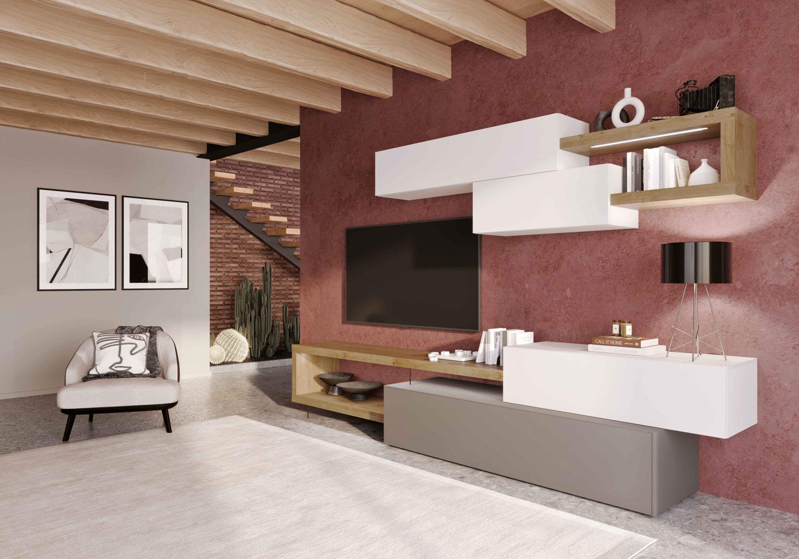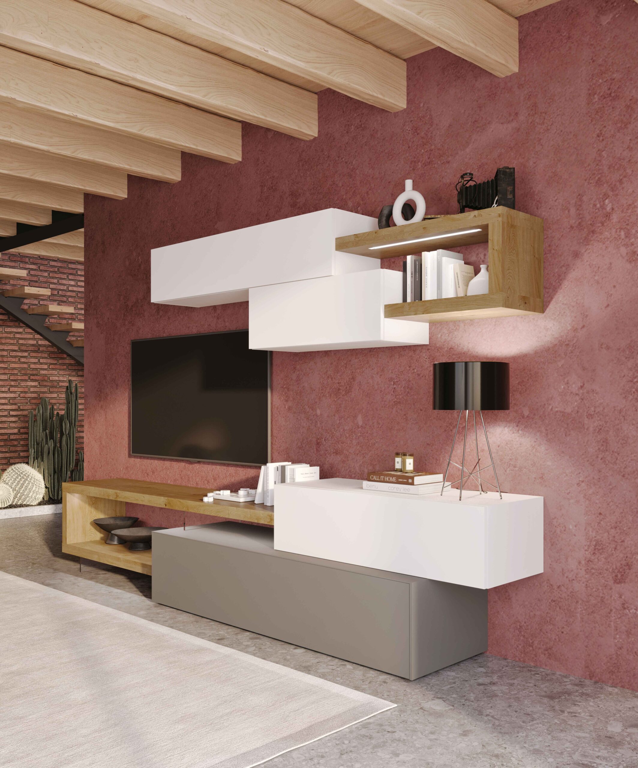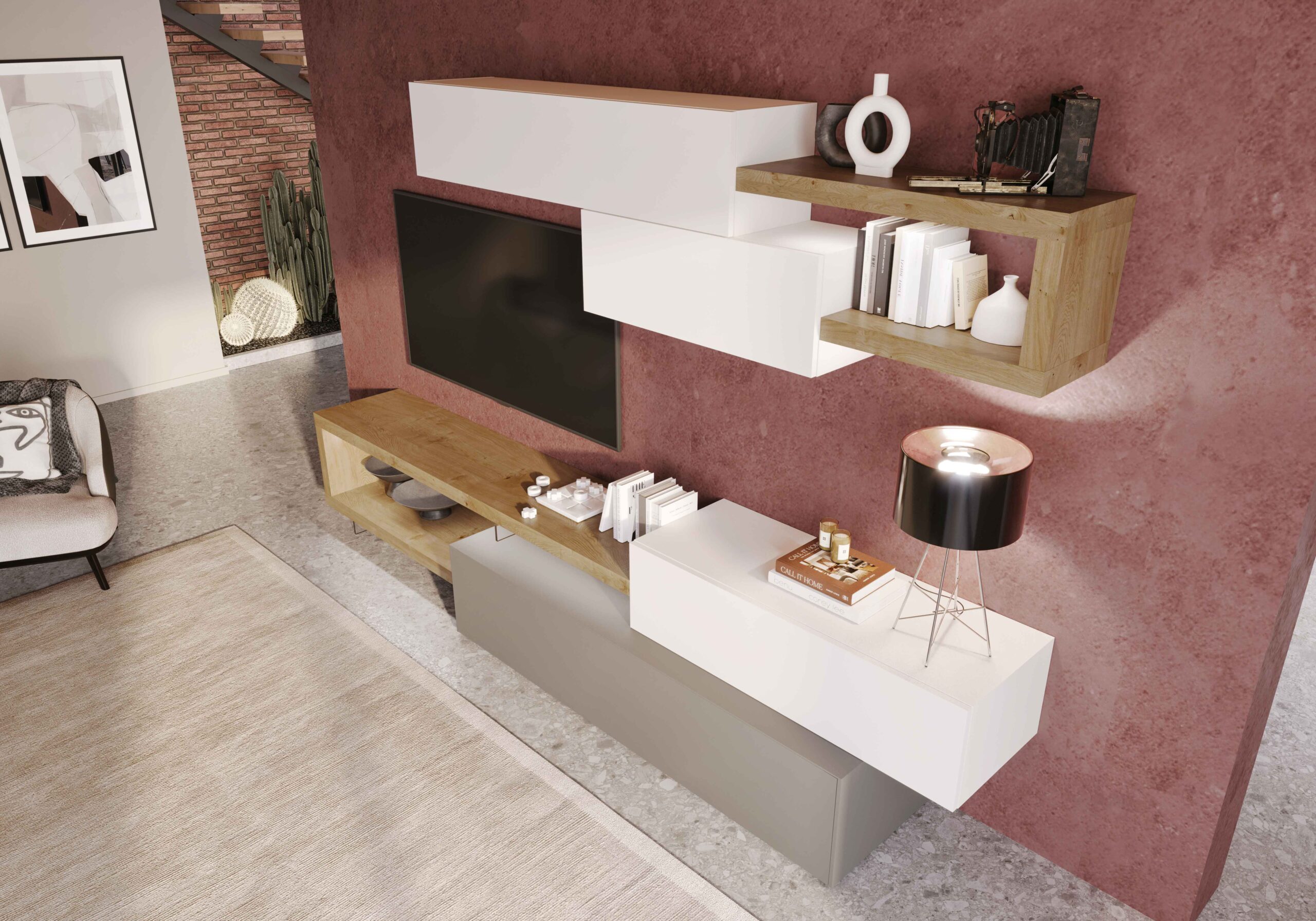 Mobile soggiorno con base a terra, dotato di un cassetto in laccato opaco con apertura a gola. Include una base in appoggio e 2 pensili in laccato opaco, arricchiti da pianali, mensole e fianchetti in rovere nodato, sostenuti da supporti in metacrilato trasparente. Questo mobile unisce design moderno e materiali di qualità, ed è disponibile su progetto e in diverse finiture. Accessori e luci esclusi.