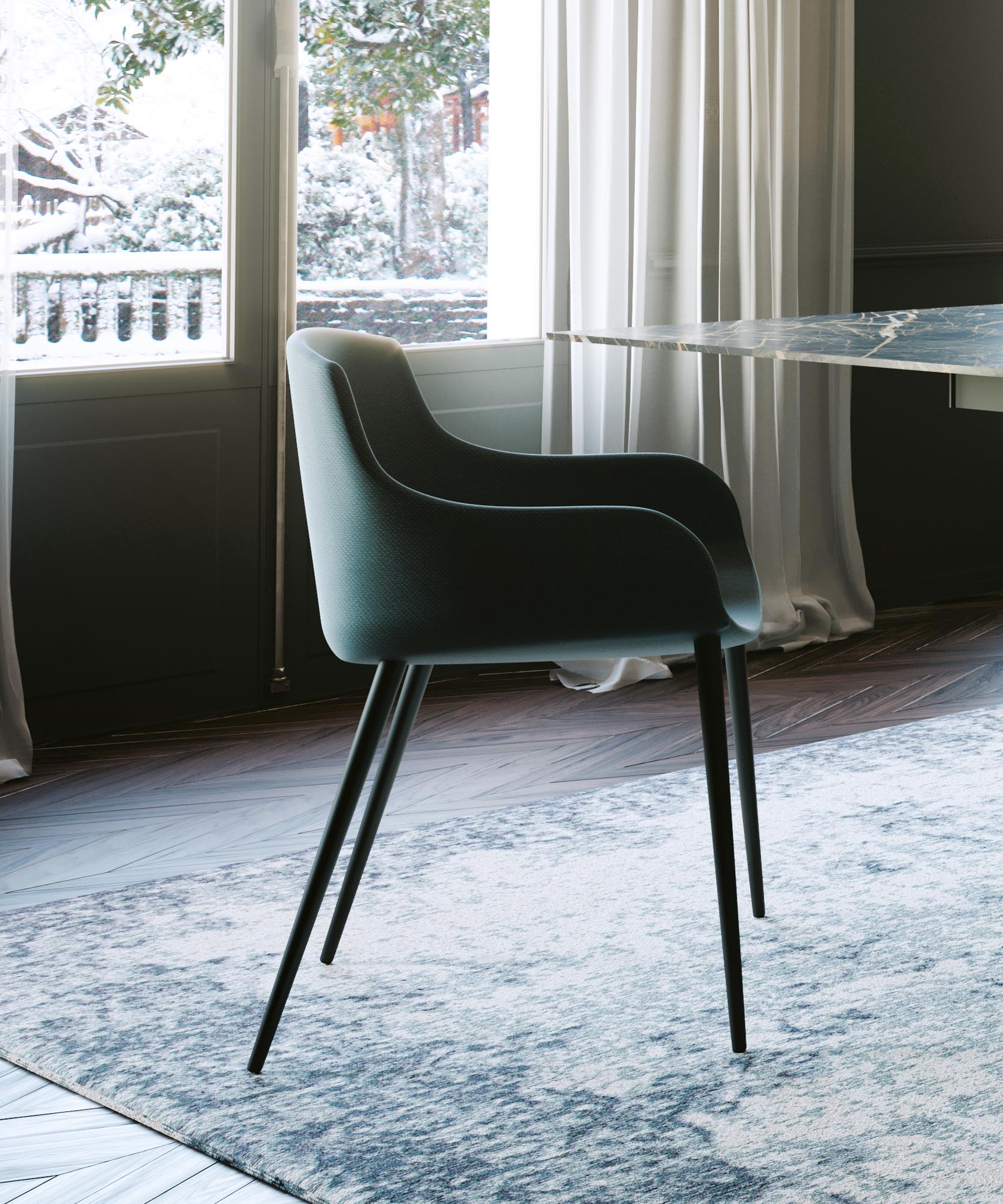 Poltroncina con seduta rivestita in tessuto o ecopelle, caratterizzata da forme avvolgenti che invitano al relax e valorizzano l’ambiente. Le gambe in metallo verniciato slanciano la silhouette e garantiscono stabilità, rendendola ideale per zona pranzo, living o spazi contract. Disponibile in diverse finiture per adattarsi con facilità a ogni contesto. Imballo minimo: 2 pezzi.